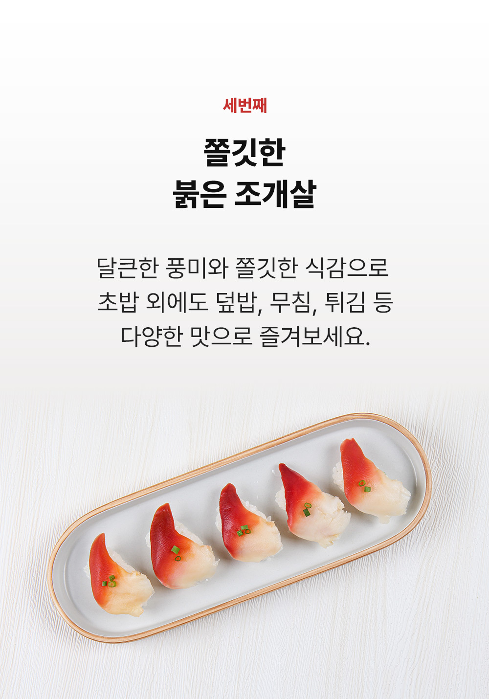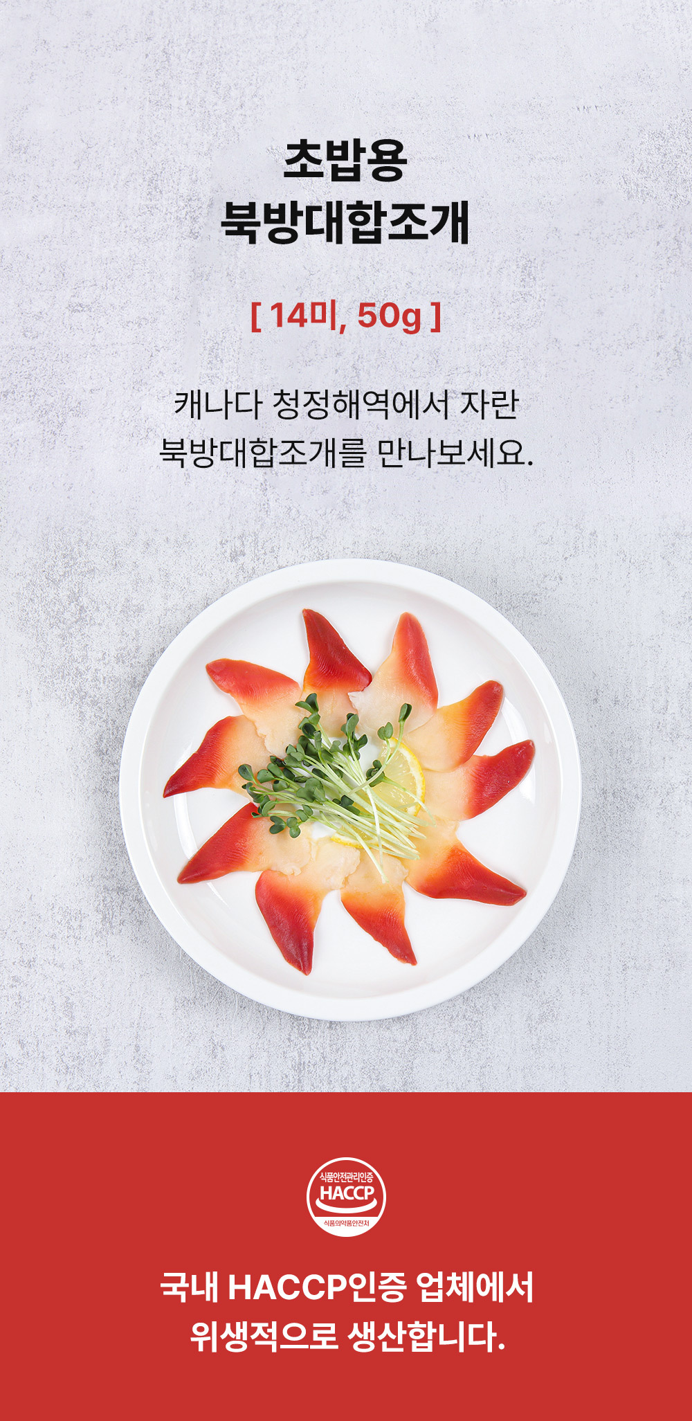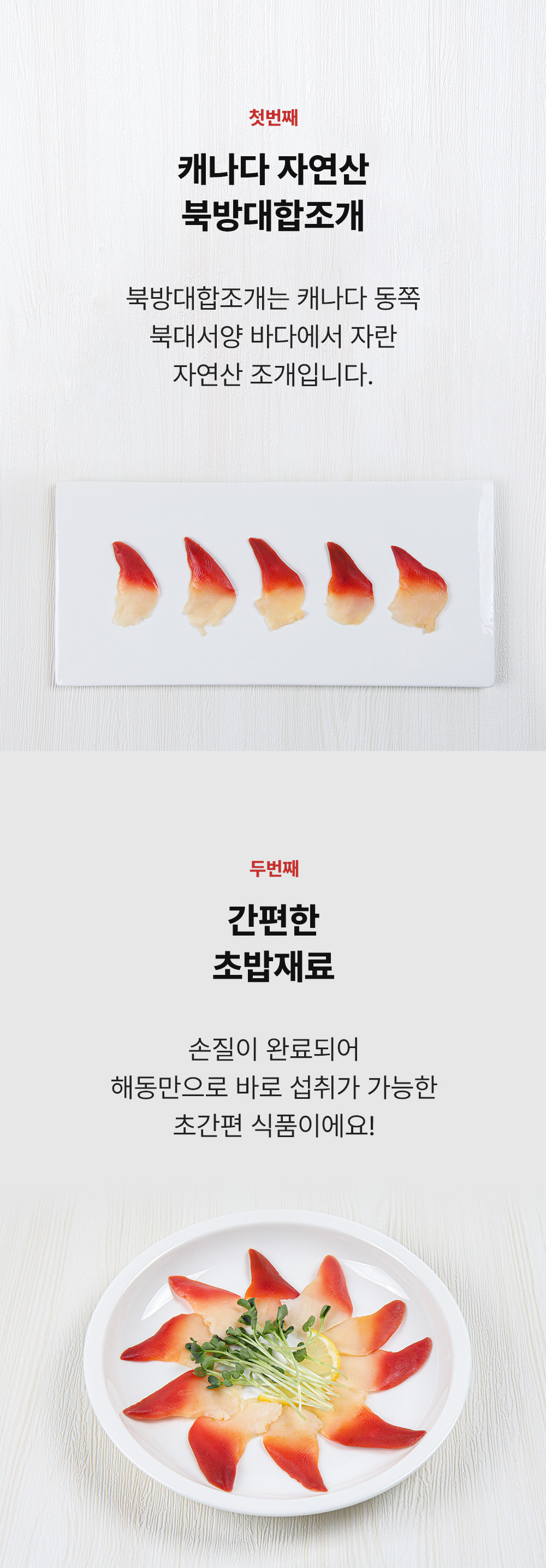 Surf clam(Hokkigai), Cockle, Propeller clam naturally grow slowly in 12 inches deep sand under the deep and cold North Atlantic Ocean which is 200~300 km away from the east coast of Canada. They do not have any artificial chemical substances, provide unique sweetness and soft flesh with deep and rich taste and nutrients, and contain an abundance of iron, Steresterol B, and Omega 3 that inhibits the accumulation of cholesterol. The surf clam, cockle & propeller clam harvested in Canada have slowly grown in deep water to develop their unique freshness and preserve their original flavors through a rapid-freezing process that is implemented onboard the ship within one hour of harvests.